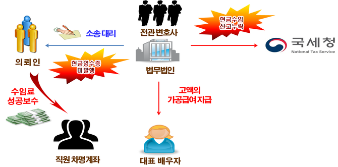 법무법인 D사는 전직 부장판사 등 소위 전관 변호사를 다수 보유한 유명 로펌으로 현금으로 챙긴 고가의 수임료에 대한 영수증을 발행하지 않고, 경리직원 이름의 계좌로 수임료를 받아 소득을 은폐했다.