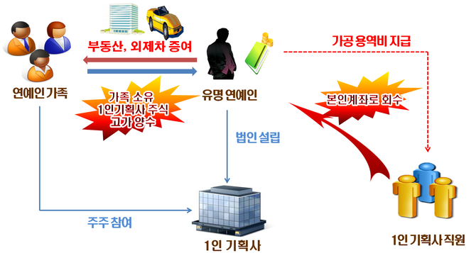 연예인 A씨가 본인과 가족명의로 만든 1인 기획사는 전형적인 소득 창구였다. A씨는 직원 명의 계좌에 가짜로 보낸 용역비를 몰래 되돌려 받는 방법으로 소득을 누락했고, 누락한 돈으로 가족에게 부동산과 고가의 외제차를 사주면서 증여세도 내지 않았다.