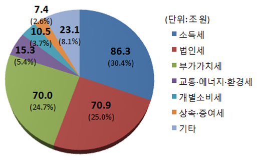 세목별로는 소득세가 86.3조원으로 가장 큰 비중(30.4%)을 차지했고, 법인세가 70.9조원, 부가가치세가 70.0조원 순이었다.
