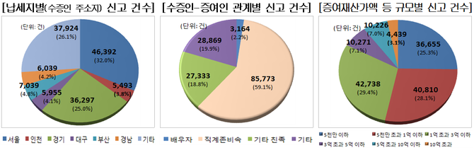 증여세의 경우 주소별로는 서울이 전체 신고 건수의 32.0%로 가장 비중이 높았으며, 직계존비속이 물려주는 경우가 59.1%, 기타 친족이 18.8%를 각가 차지했다.