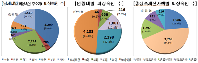 주소별로는 서울이 전체 피상속인 수의 39.0%로 가장 많았으며, 재산을 물려주는 피상속인 연령별로는 80세 이상이 전체의 49.0%를 차지했다.