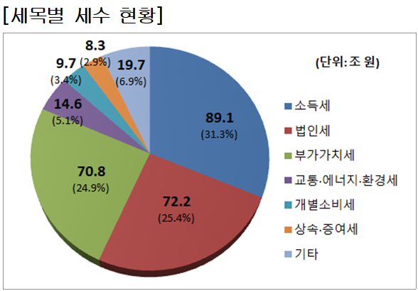 주요 세목 가운데 세수가 가장 많았던 건 소득세(89조원)으로 법인세(72조원), 부가가치세(71조원). 교통·에너지·환경세(15조원), 개별소비세(10조원), 상속·증여세(8조원) 등이 각각 뒤를 따랐다.