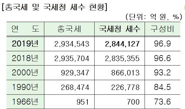 전년대비 국세 증가비율은 0.3%였지만, 관세가 줄어들면서 총 국세 내 구성비는 0.3%포인트 증가한 96.9%로 나타났다.