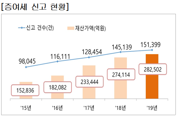 지난해 증여세 신고 건수는 15만1399건으로 2018년(14만5139건) 대비 4.3%포인트 증가했다.