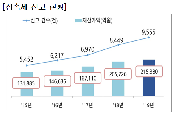 신고한 상속재산은 21조5380억원으로 2018년(20조5726억원)보다 4.7%포인트 늘었다.