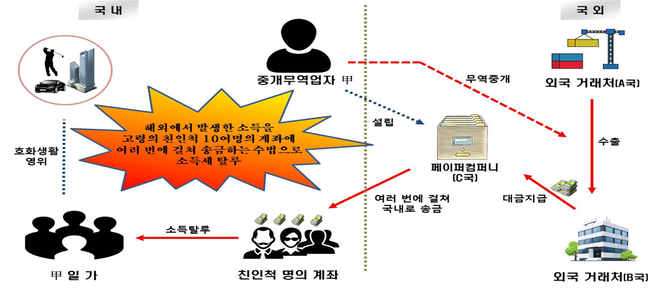 甲은 페이퍼컴퍼니의 명의로 벌어들인 미신고 소득을 몰래 국내로 반입하기 위해 80대 부모 등 고령이면서 소득이 없는 일가친척 10여 명의 계좌에 송금 하는 수법으로 소득세를 탈루한 혐의를 받고 있다.