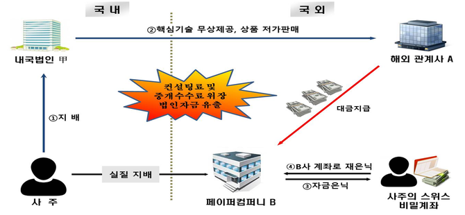 해외 관계사 A에게 약품 제조 핵심기술을 무상제공하고 약품을 저가로 판매하는 수법으로 국내에 귀속되어야 할 이익을 일단 국외로 이전한 후,별도로 설립한 페이퍼컴퍼니 B가 해외 관계사 A에게 컨설팅 및 중개용역을 제공하고 컨설팅료·중개수수료를 지급받은 것으로 위장해 A사의 회삿돈을 빼돌렸다.