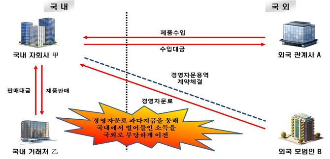 국내 자회사 甲은 외국 모법인 B가 실제로 제공한 용역에 비해 터무니없는 고가의 경영자문료를 매년 지급하고, B법인으로부터 넘겨받는 물품의 수입가를 부풀리는 수법으로 국내 법인세를 회피하다가 국세청으로부터 수백억원의 추징을 받았다.