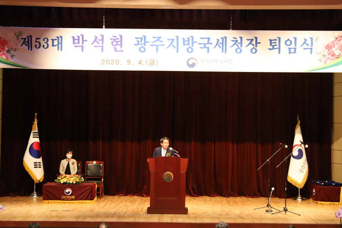 제53대 박석현 광주지방국세청장의 퇴임식이 4일 광주청 강당에서 진행됐다. 박 광주청장은 "사무관시절부터 광주청장에 이르기까지 광주청 직원 여러분과 4번이나 같이 근무하고 마지막까지 함께 할 수 있게 되어 영광스럽게 생각한다"고 퇴임사를 시작했다.