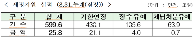 한편, 국세청은 올해 1월부터 8월까지 코로나19·태풍 등 재해재난으로 경영상 어려움이 있는 납세자에 대해 599.6만건, 25조8000억원 규모의 세정지원을 실시한 바 있다.