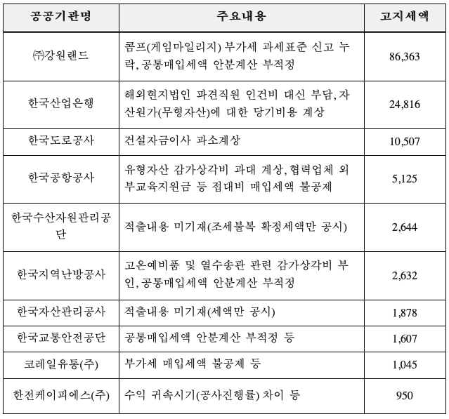지난해의 경우 국세청은 24곳의 공공기관에 대한 세무조사를 실시해 총1천637억 원의 세액을 추징했다. 개별 공공기관 세무조사 현황을 살펴보면, 강원랜드가 부가세 과세표준 신고 누락, 공통매입세액 안분계산 부적정 등의 이유로 863억 원을 추징당해 조사받은 공공기관 중 추징세액 1위를 차지하는 불명예를 얻었다.