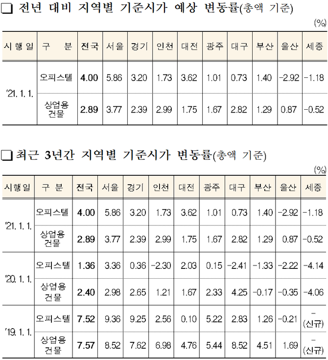 2020년 대비 내년도 지역별 예상 기준시가를 보면 전국 오피스텔은 4.00%, 상가는 2.89% 증가할 전망이다.