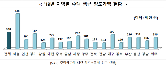 주택 소재지별 평균 양도가액은 서울 7억3800만원, 경기 3억1200만원, 대구 2억9900만원 순이었다.