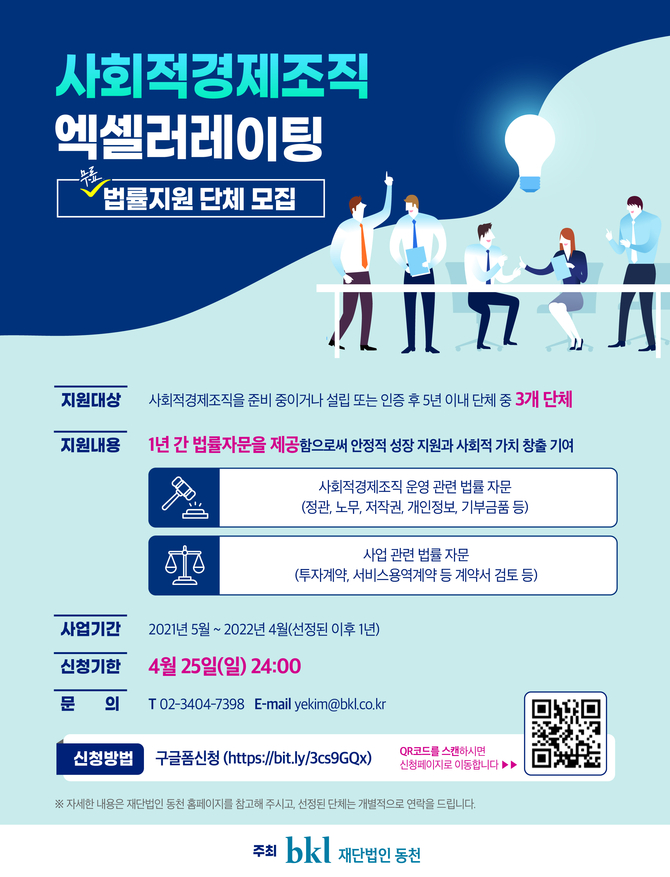 25일까지 ‘제1회 사회적경제조직 엑셀러레이팅 무료법률지원’ 단체를 모집한다고 밝혔다.