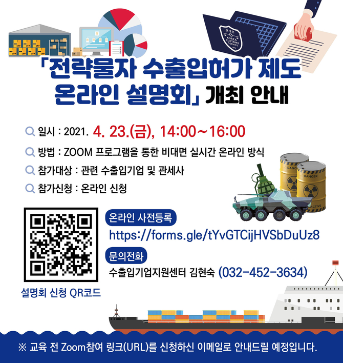 (조세금융신문=홍채린 기자) 인천본부세관은 방위사업청 및 전략물자관리원의 전문강사를 초빙하여 ‘전략물자 수출입허가 제도 설명회’를 23(금)에 온라인으로 개최한다고 밝혔다.