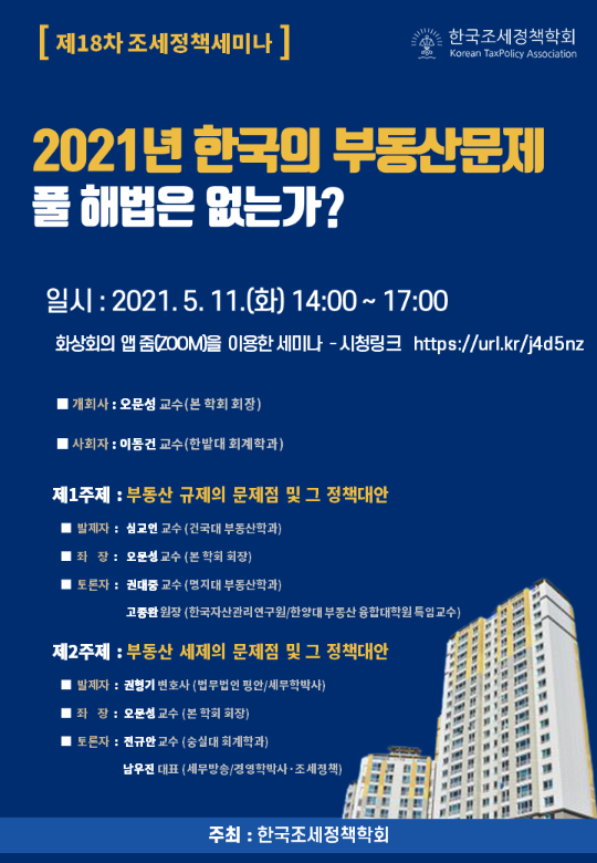 한국조세정책학회는 내달 11일 오후 2시 18차 조세정책 세미나에서 심교언 건국대 교수를 통해 ‘부동산 규제의 문제점 및 그 정책대안’을 듣고, 권대중 명지대 교수, 고종완 한국자산관리연구원장(한양대 특임교수)과 함께 부동산 문제 해결방안에 대해 논의한다.