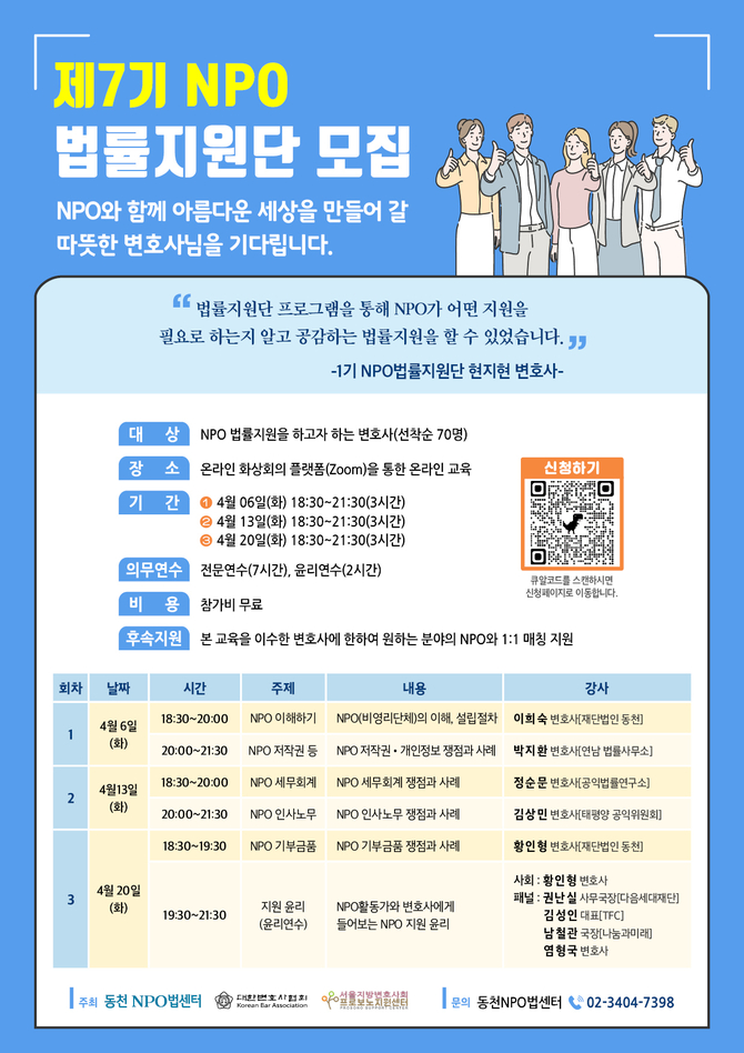 (조세금융신문=고승주 기자) 동천NPO법센터(센터장 유욱 변호사)가 지난 6일부터 20일까지 ‘제7기 NPO법률지원단’ 연수 프로그램을 진행했다.