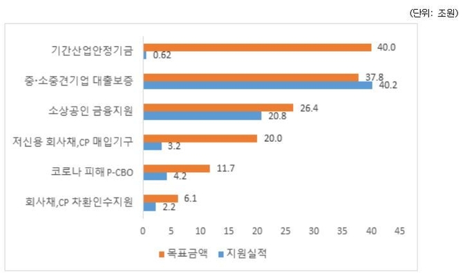 보고서에 따르면 기간산업안정기금은 40조원 규모로 출범했지만, 올해 4월까지 지원실적은 약 6천억원으로 1.5%에 그쳤다. 지원 실적이 낮은 이유로는 지원요건이 까다롭다는 점이 지적됐다. 저신용 회사채·CP 매입기구(SPV)도 최대 20조원으로 조성됐지만, 지원을 위한 문턱이 높아 현재 매입 실적은 3조2천억원에 그친 것으로 나타났다.