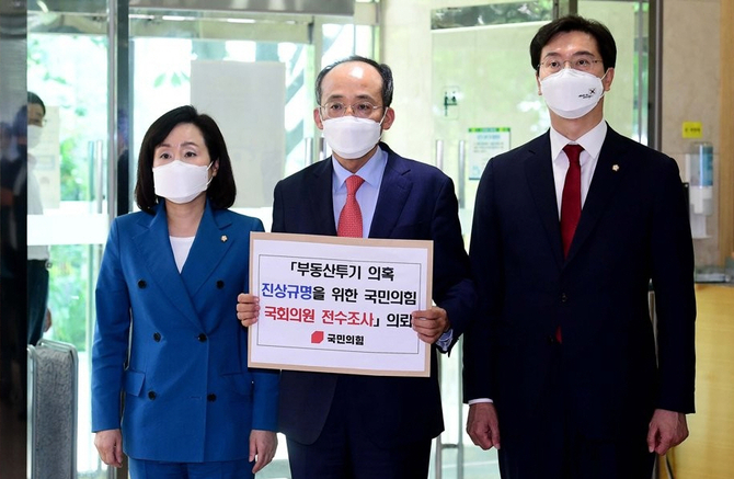 국민의힘 추경호 원내수석부대표, 전주혜‧강민국 원내대변인은 지난 9일 서울 종로구 감사원에 국민의힘 국회의원 부동산 투기 전수조사를 의뢰했다.