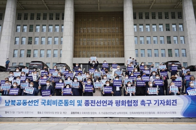 (조세금융신문=고승주 기자) 더불어민주당, 정의당, 열린민주당이 250여개의 시민사회단체와 함께 17일 오전 11시 국회의사당 본청 앞에서 기자회견을 열고 ‘남북공동선언 국회비준동의 및 종전선언과 평화협정’을 촉구했다.