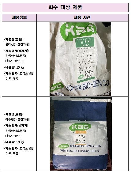회수 대상은 제조일자가 2019년 6월 19일 이후로 표시된 제품이다. 식약처는 "해당 제품을 구매한 경우 구입처에 반품해달라"고 요청했다.