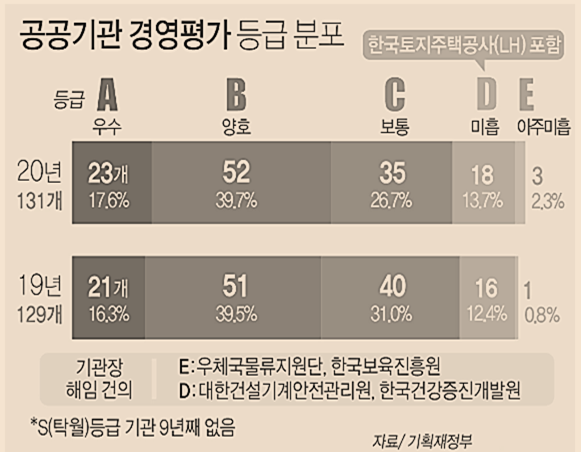 기재부는 매년 공기업·준정부기관의 경영 실적에 대한 직무 수행 실적을 평가해 'S(탁월)'부터 'E(아주 미흡)'까지 등급을 매기고, 해당 등급에 따라 차등적으로 직원 성과급을 부여하고 있다.
