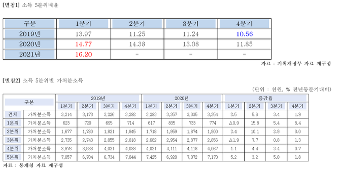 양경숙 더불어민주당 의원이 정부로부터 받은 자료에 따르면 소득 5분위배율은 지난 2019년 4분기 11배에서 2020년 1분기 15배, 4분기 12배, 2021년 1분기 16배를 기록했다.