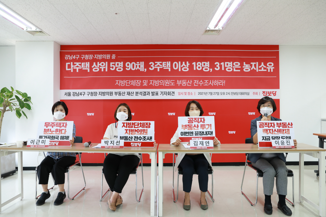 부동산투기공화국해체·제2토지개혁을 위한 진보당 운동본부(진보당)는 27일 오후 기자회견을 열고 강남 4구 구청장과 지방의원 본인 및 배우자·자녀 부동산 재산 실태 조사 결과를 발표했다.