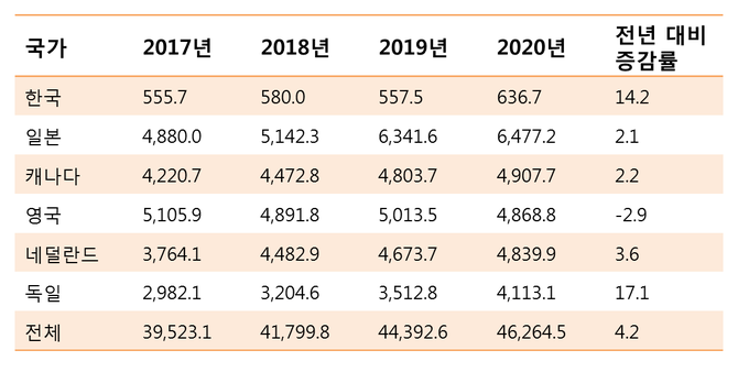 한국의 대미 직접투자는 도널드 트럼프 전 대통령의 취임 첫해인 2017년 555억7천만달러에서 2018년 580억달러로 늘었다가 2019년 557억5천만달러로 감소한 뒤 지난해 다시 크게 증가했다.