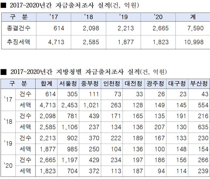 27일 국세청이 김상훈 국민의힘 의원(대구 서구)에게 제출한 ‘2017~2020년간 자금출처조사 현황’에 따르면, 2017년 614건에 불과했던 조사건수가 2018년 2098건, 2019년 2213건, 2020년에는 2665건에 달했다.