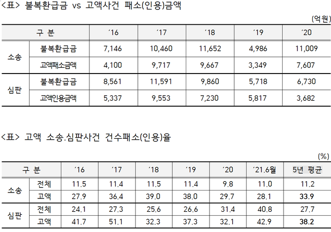 고액 소송·심판 건수 패소(인용)율은 최근 5년간 30~40% 수준에 달했다. 5년 평균 고액 소송 패소율은 33.9%로 전체 평균 11.2의 3배에 이르렀으며, 심판사건 패소율 역시 38.2%로 전체 심판사건 패소율 27.7%를 훨씬 웃돌았다.