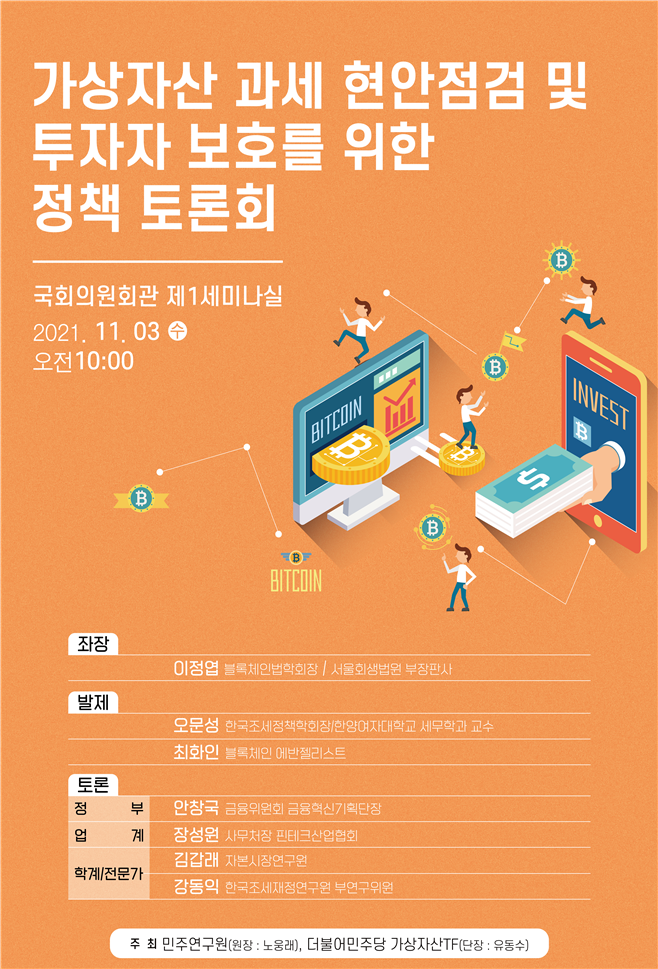 (조세금융신문=고승주 기자) 정부가 내년 가상자산 과세를 앞두고 있는 가운데 국내 가상자산 시장에 대한 체계적 관리 및 보호체계부터 우선돼야 한다는 내용의 정책토론회가 열린다.