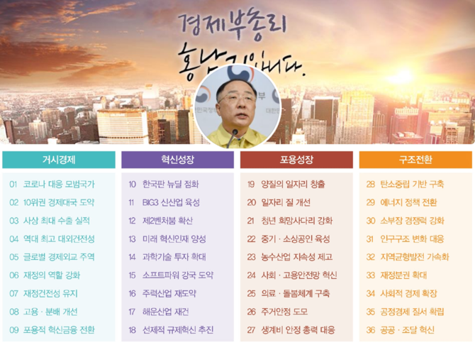 홍 부총리는 10일 페이스북에 "이번 정부의 지난 5년간 경제 분야 성과와 과제를 있는 그대로 국민 여러분들에게 알려드리기 위해서 오늘부터 약 15일간 (36대 경제와 과제를) 매일 약 3개 내외로 묶어 차례대로 올리고자 한다"고 적었다.