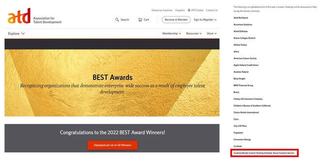 2022년 인재개발협회 ‘베스트 어워즈’ 부문 수상자는 관세인재원을 비롯해 미국 관세청 등 총 73개 기관이 선정됐다.