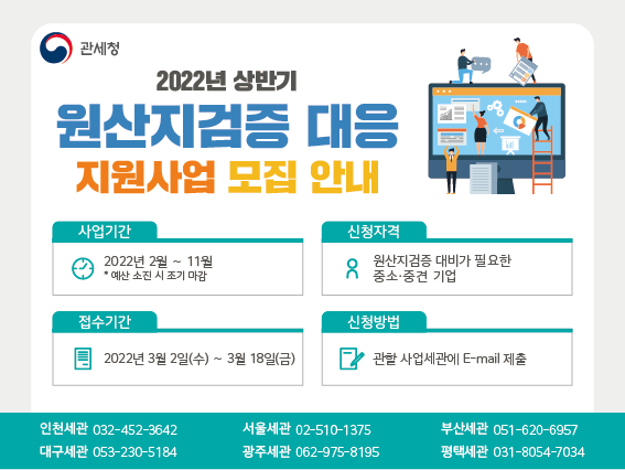 끝으로, 원산지검증 대응 지원사업은 사업세관 담당자에게 전화 또는 전자우편으로 문의해 자세한 상담을 받을 수 있다.