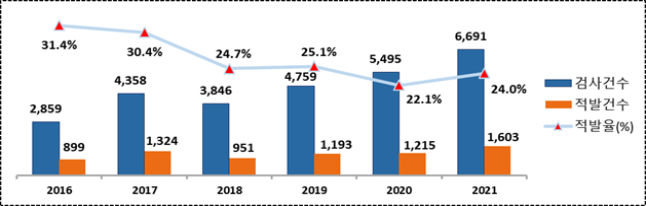 한편, 국표원과 관세청이 지난 6년간 전기·생활용품 및 어린이제품에 대해 통관단계에서 협업검사를 지속 확대·홍보한 결과 불법제품 적발률이 2016년 대비 7.4%p 감소하는 등 위해제품의 반입 차단 효과가 나타나고 있다.