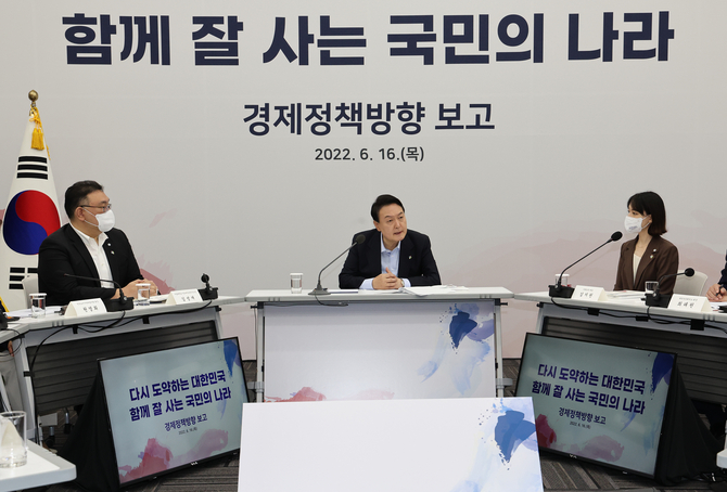 윤 대통령의 모두발언 이후 추경호 부총리가 '새정부 경제정책방향'에 대해 보고했고, 이후 참석자들이 ▲ 민간중심 경제 활력 제고 및 성장·복지의 선순환 방안 ▲ 경제체질 개선과 미래 대비·민생 안정 등 2가지 주제를 놓고 토론했다.