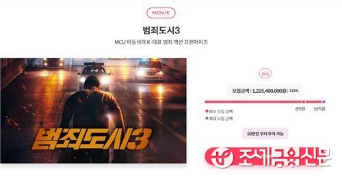 내년 개봉 예정인 '범죄도시 3'는 콘텐츠 투자 플랫폼 펀더풀에서 지난 21일 투자 모집을 시작한 지 1시간 만에 목표총액 10억원을 돌파했다. 펀더풀은 당초 5억원을 모집할 계획이었으나, 모집을 시작한 당일 투자자들이 몰려 목표액을 10억원으로 늘렸다.