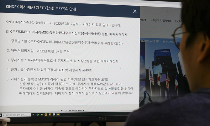 지난 2월 이후 러시아 증시 폭락과 MSCI의 러시아 관련 지수 산출 방식 변경 등으로 'KINDEX 러시아MSCI(합성) ETF'는 상장 폐지 위험에 처하기도 했다.