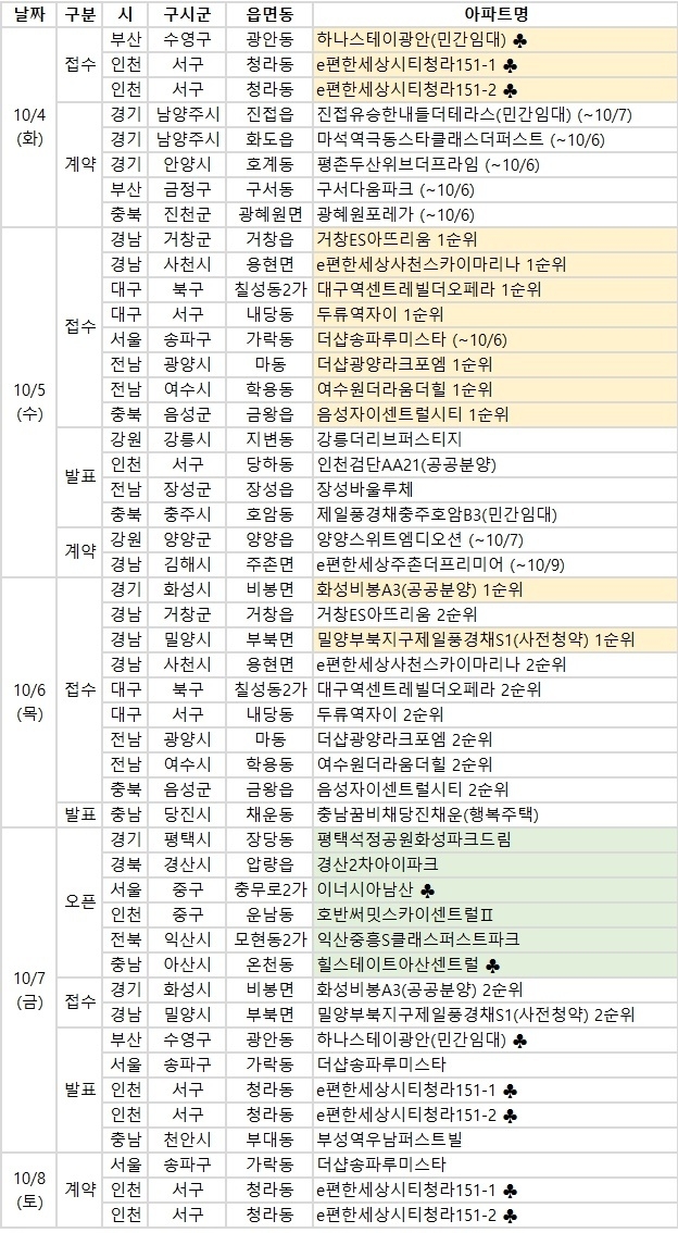 주요 분양물량은 인천 서구 청라동 'e편한세상시티청라(오피스텔)', 충북 음성군 금왕읍 '음성자이센트럴시티', 전남 광양시 마동 '더샵광양라크포엠' 등이다.