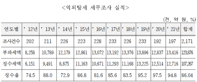 역외탈세 조사 징수율은 2012년 74.5%였으나, 2016년 81.6%, 2017년 85.6%, 2018년 83.5% 등 80%대에 머물렀다가 2019년 95.2%, 2020년 97.5%까지 올랐다가 지난해 94.8%로 소폭 감소했다.