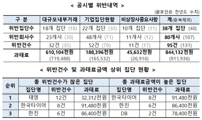 과태료 부과액은 한국타이어(9천148만원), 한진[002320](8천640만원), DB[012030](7천840만원) 순으로 많았다. 위반 건수가 많은 기업집단은 태영(12건), 한국타이어(8건), 한진(6건) 등이었다.