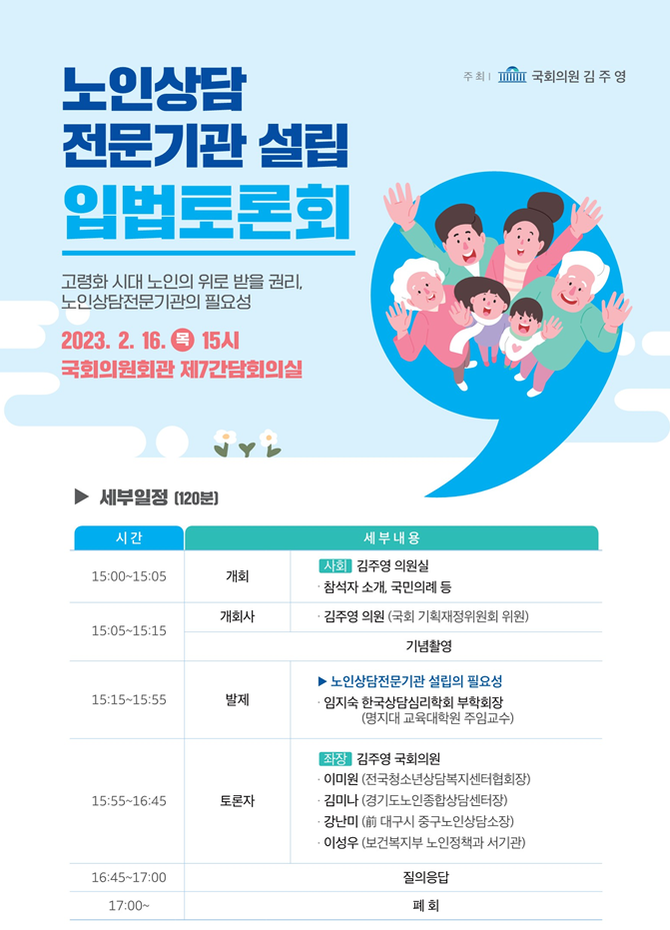 토론 참여자료는 임지숙 한국상담심리학회 부학회장 (명지대 교육대학원 주임교수)이 발제를, 이미원 전국청소년상담복지센터 협회장과 김미나 경기도노인종합상담센터장, 강난미 前 대구시 중구노인상담소장, 이성우 보건복지부 노인정책과 서기관이 참석한다.