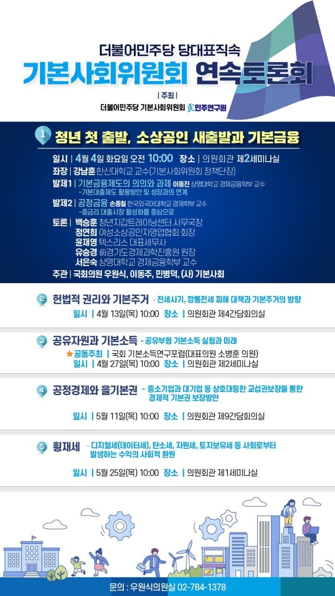 토론회에는 이재명 기본사회위원장, 우원식 기본사회위 수석부위원장, 박정 기본사회위 부위원장, 이동주, 김병기, 소병훈, 김성주 의원 등 여러 원내 인사가 참석하고, 민주정책연구원이 공동주최한다. 주관은 우원식, 이동주, 민병덕 의원실과 사단법인 기본사회 재단이 맡는다.