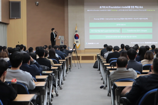 하 소장은 초거대 AI(ChatGPT, HyperCLOVA 등)의 기능, 발전방향, 정부업무와 연계한 활용방안 등을 발표했으며, 특히 네이버 초거대 AI(HyperCLOVA)를 활용한 관세청 민원 상담을 시연하여 참석자들의 큰 호응을 얻었다.