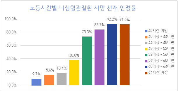 주 56시간 이상~60시간 미만, 60시간 이상~64시간 미만의 경우 과로사 산재 승인율은 각각 83.7%, 92.2%로 집계됐다. 주 4시간 증가마다 산재 사망 인정률이 거의 10%포인트 가까이 늘었다.