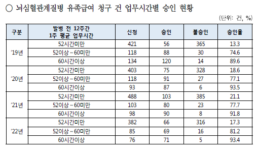 국회 기획재정위원회 소속 김주영 더불어민주당 의원이 6일 공개한 근로복지공단 ‘최근 4년 뇌심혈관질병 업무시간별 산재 승인 및 유족급여 승인 현황’ 자료에 따른 결과다.
