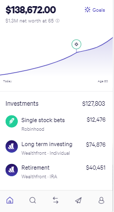 증권시장 이외에 리츠, 암호화폐 등 투자 다각화에 신경 쓴 점을 높게 평가하는 부분이다. 앱의 UI를 확인하면 왜 이 기업의 앱 평점이 높은지 알 수 있다. 직관적이고 깔끔한 UI, 빠른 회원가입 등의 이유이다. wealthfront는 로보어드바이저를 필두로 한 유사 은행이라고 생각한다. 직불카드 및 예금 이자가 존재, 포트폴리오의 30% 조건 없는 대출, 로보어드바이저 투자, 은퇴계좌가 있다.