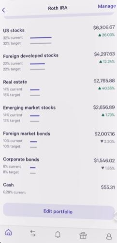 모든 과정을 거치면 로보어드바이저가 투자자에게 맞는 포트폴리오를 계획한다. 만약 포트폴리오가 맘에 안 들면 포트폴리오 고객 맞춤형으로 자산 재조정이 가능하다. 자신의 취향에 따라 비중, 상품 조정이 가능하다는 의미이다. 포트폴리오는 17개자 자산 항목, 200개가 넘는 ETF 그리고 2개의 암호화폐 상품 내에서 이루어진다. ETF 상품으로는 미국 주식, 배당주, 국채, 부동산, 신흥시장 주식 등이 있다. wealthfront의 특이점 중 하나는 대출이다.