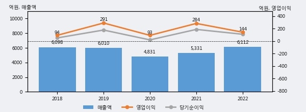 최근 실적을 살펴보면 2022년 매출액이 최근 5년 중 가장 높은 실적을 기록했음을 알 수 있다. 이전 최고 실적이었던 2018년 보다도 0.2%(14억 3천만원) 늘어난 것으로 나타났다.
